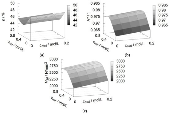 Effect of the addition of oxalic and nitric acid on the coating and process properties as predicted by the response function, (a) porosity p, (b) hardness decline H*, (c) hardness in a distance of 20 microns from the substrate/oxide interface.