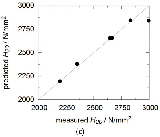 Comparison between values predicted by the response function and measured values for (a) porosity p, (b) hardness coefficient H*, (c) hardness in a distance of 20 microns from the substrate/oxide interface.