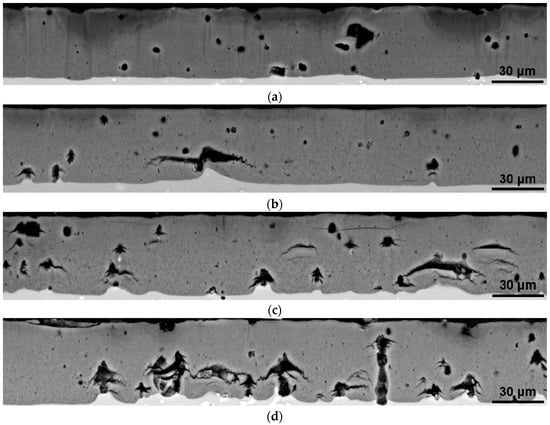 The micron scale porosity of the coatings was examined by electron microscopy using the BSD detector. As can be seen from Figure 6a, the anodic oxide coatings from the base electrolyte contain plenty of spheroidal voids with diameters of less than 5 μm and some irregularly formed voids with dimensions of more than 10 μm. From grey-scale analysis, an average micron scale porosity of 3.4 ± 0.8% was obtained. With the addition of 0.4 mol/L and 0.8 mol/L nitric acid, a similar amount of cracks occurs at large voids (represented by Figure 6b). Hence, the microscale porosity increases to 4.6 ± 1.3% and 4.6 ± 0.8% respectively. With the addition of 0.2 mol/L oxalic acid, the number and volume content of the cracks generally increases for all nitric acid concentrations. The micron scale porosity ranges from 5.8 ± 1.6% for the single addition of 0.2 mol/L oxalic acid (Figure 6c) to 8.4 ± 0.7% for 0.8 mol/L nitric acid and 0.2 mol/L oxalic acid (Figure 6d) respectively. The roughness of the substrate–coating interface close to large voids seems to increase with increasing nitric acid and in particular with increasing oxalic acid concentrations. For the highest additive concentration, several large voids are connected by crack networks (Figure 6d).
