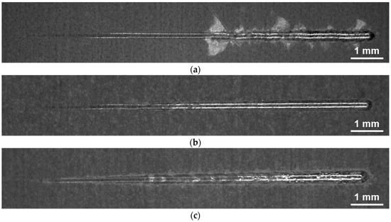 Light microscope images of coating failure after progressive scratch test: (a) 20 vol % H2SO4, (b) 20 vol % H2SO4 + 0.2 mol/L C2H2O4, (c) 20 vol % H2SO4 + 0.8 mol/L HNO3.