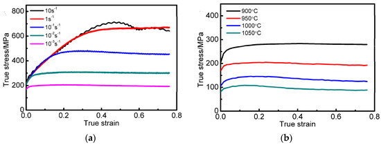 The measured true stress–true strain curves are presented in Figure 2. As shown in Figure 2, the flow stress is sensitive to the temperature and strain rate. When the alloy is deformed at 10 s−1, an abnormal softening phenomenon caused by adiabatic heating is observed. However, only slight softening can be detected at other conditions, even if the deformation was carried out under the lowest strain rate (10−3 s−1) and highest temperatures (1050 °C). It is well-known that DRX intensively occurs in the hot deformation process of Ni-based alloys, resulting in dynamic softening of the alloys and continuous decreasing of the flow strength. The slight softening of the alloy can be explained by the variation of the DRX mechanism [11,16,17,18]. At high strain rates or low deformation temperatures, discontinuous DRX (DDRX) occurs, resulting in obviously softening. Besides, the continuous DRX (CDRX) prefers to initiate and thus leads to slight softening, when deforming at low strain rate and high temperature conditions. For the flow curves, the synergic effect of the two DRX mechanisms reduces the corresponding flow stress from approximately 650 MPa at 10 s−1 to 200 MPa at 10−3 s−1 in Figure 2a. Similarly in Figure 2b the flow stresses reduces from 275 MPa at 900 °C to 100 MPa at 1050 °C.