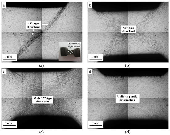 When the samples were compressed at “intermediate” conditions (high temperature or low strain rate), as shown in Figure 3b, the shear bands broadened and evolved into a form with “X” shape.