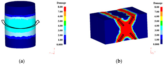where C is the damage factor, σmax is the highest local tensile stress, is the true strain and is the true strain at fracture. When a cylindrical specimen is uniaxially compressed as shown in Figure 4a, the additional tensile stress is localized at the equator of the bulge area (indicated by arrow). This additional stress, however, cannot give rise to the formation of shear band because the direction of the stress is along the circle and perpendicular to the primary stress axis. When the specimen is subjected to plane strain compression, as shown in Figure 4b, the stress concentration occurs in an “X” type region of the specimen. The “X” type stress concentration is supposed to be related to surface tension of the specimen and the friction during deformation. It is clear that the stress concentration significantly promotes the occurrence of shear band due to the favorable orientation. As a result, the plane strain compression is easier to induce the initiation of shear bands in comparison with uniaxial compression.