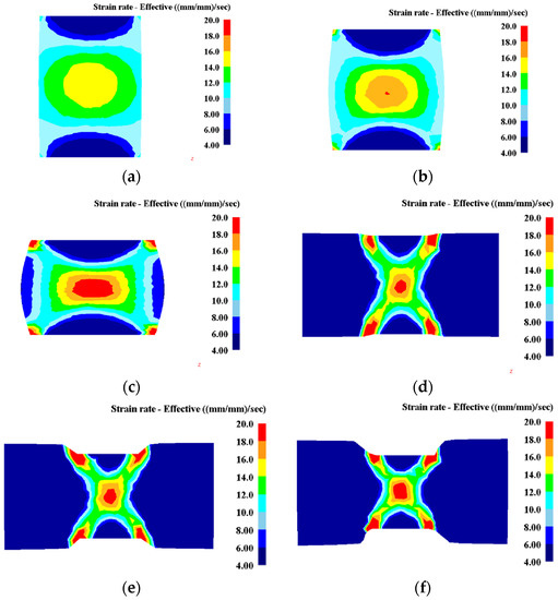 The distribution of the effective strain-rate in Inconel 718 superalloy under (a–c) uniaxial compression and (d–f) plane strain compression at height reduction of (a,d) 5%; (b,e) 20%; (c,f) 30%.