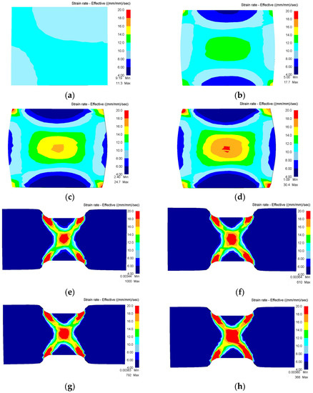Effective strain-rate distribution of Inconel 718 superalloy under (a–d) uniaxial compression and (e–h) plane strain compression at height reduction of 30% for different friction conditions, (a,e) f = 0, (b,f) f = 0.1, (c,g) f = 0.2, (d,h) f = 0.3.