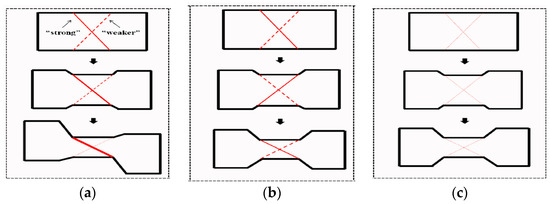 As it has been clarified in Section 3.2, the severe deformation conditions tend to produce “S” type shear bands, while the intermediate deformation conditions prefer to induce “X” type shear bands. Note that both microstructure observations (Figure 3) and FEM simulations (Section 3.3) suggest that the morphology of shear bands at the initial stage exhibits “X” type with two crossed branches, as illustrated in Figure 7. It can be confirmed that the strength of the two branches is not exactly the same—one is “stronger” and the other one is “weaker”. The final shape of these shear bands depends on deformation conditions, interfacial friction and material properties. The evolution process is interpreted in a phenomenological way as follows.