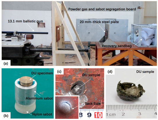 Experimental setup and depleted uranium (DU) sample. (a) The experimental setup. (b) The DU sample before impact testing. (c) The DU sample embedded into and almost completely penetrated the 4340-steel plate at a velocity of 1300 m/s. (d) The residual sample was taken down from the 4340-steel plate after the impact test.
