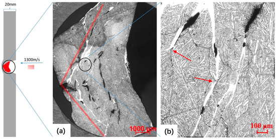 Figure 4 shows the metallographic microstructure of the adiabatic shear bands of a cylindrical U-0.75 wt % Ti sample (8 mm diameter, 12 mm length) after being embedded in a 4340-steel plate. Figure 4 was automatically spelled throughout the residual sample by a ZEISS Axio Scope A1 in a magnification of 100×. From Figure 4a, we can clearly see that the distribution of shear bands was mostly concentrated in the two outer sides of the cross section (marked by the red lines with an interior angle of nearly 110°). The centerline of the interior angle was parallel to the impact direction of the U-0.75 wt % Ti alloy into the 4340-steel plate, as indicated by the arrows in Figure 4. This kind of shear band distribution is very important.