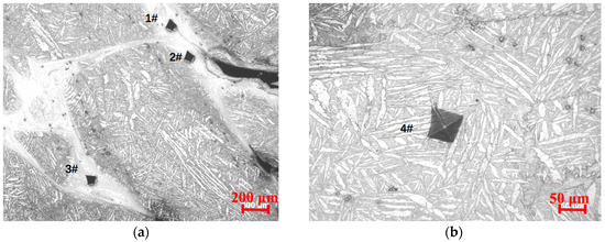 Vickers micro-hardness test results obtained from one sample are shown in Table 2. The micro-hardness in the adiabatic shear zone was on average 18% lower than that in the matrix. Figure 6 presents the micro-hardness metallographic photographs of shear bands and material matrix. The micro-hardness metallographic photographs of #5 and #6 were tested in the material matrix but are not shown in this figure. The #2 test position in Figure 6a was close to the sample matrix, so its micro-hardness results were greater than that of the fully inner shear band.