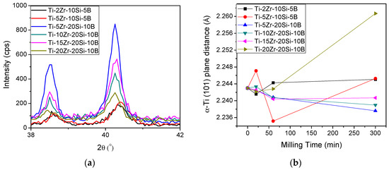 (a) X-ray scattering on the major α-Ti peaks in Ti-Zr-Si-B powder mixtures milled for 60 min; and (b) interplanar distance “d” of α-Ti (101) crystal plane as a function of composition and milling time in the Ti-Zr-Si-B powder mixtures.