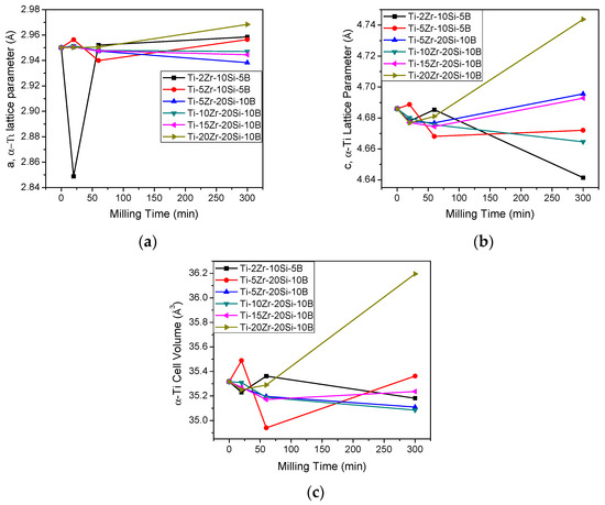 Effect of composition and milling time on the: (a,b) lattice parameters; and (c) cell volume of α-Ti in the Ti-Zr-Si-B powder mixtures.