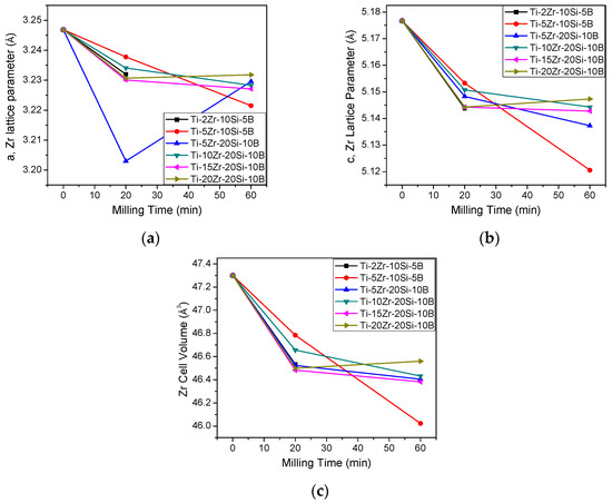 Figure 4 shows the effect of composition and milling time on the Zr lattice parameters and cell volume. As previously discussed, a partial Zr amount was dissolved into the α-Ti cell during ball milling of Ti-Zr-Si-B powders up to 300 min. Nonetheless, the Si atoms were also dissolved into the Zr lattice during 20 and 60 min. Consequently, the cell volume was also decreased at these times.