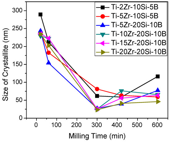 The crystallite sizes of Ti of mechanically alloyed Ti-xZr-Si-B (x = 2, 5, 10, 15 and 20 at. %) powders are presented in Figure 5. In the Ti-xZr-10Si-5B powders (x = 2 and 5 at. %), the sizes of crystallite were continuously reduced with the increase milling time, except for the Ti-2Zr-10Si-5B powders milled for 600 min. Sizes of crystallite were initially reduced in the Ti-xZr-20Si-10B (x = 5, 10, 15, and 20 at. %) powders milled up to 300 min, which were subsequently increased during milling up to 600 min. As previously mentioned, the heat released from exothermic Ti5Si3 reaction has contributed for reducing the number of defects provided during ball milling and, consequently, the amount of number of sites available to form the supersaturated solid solutions. Other study has also reported on formation of metastable structures in mechanical alloyed Ti-Si powders [28]. Moreover, the results indicated that the zirconium addition has contributed to reduce the Ti crystallite sizes, denoting that its addition provided higher distortion into the Ti lattice and favored the occurrence more effective between the cold welding and fracture mechanisms during ball milling of the Ti-xZr-20Si-10B powder mixtures. Previous work has also reported on the preparation of nanocrystalline Ti-Si powders by mechanical alloy [29].