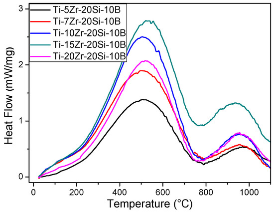The DSC curves obtained during heating of mechanically alloyed Ti-xZr-20Si-10B (x = 5, 10, 15 and 20 at. %) powders milled for 600 min are illustrated in Figure 7. It can be noted the occurrence of two exothermic peaks located near the 500 °C and 950 °C. According to the X-ray diffraction analysis, these exothermic peaks are related to the formation of intermetallic phases such as Ti6Si2B, Ti5Si3, and TiB. Table 2 presents the peak temperature as well as the heat flow and enthalpy values relative to the major exothermic peak identified in DSC curves during heating of Ti-xZr-20Si-10B (x = 5, 10, 15 and 20 at. %) powders milled for 600 min. Results have indicated that the DSC peak temperature varied between 502.9 and 521.8 °C from the powder mixtures with 5 and 20 at. % Zr, respectively. Excepting to the powder mixture containing 20 at. % Zr, it was also noted that the enthalpy values (and released heat flow) increased from 498.2 kJ/kg (1.383 mW/mg) to 1008.3 kJ/kg (2.792 mW/mg) in Ti-5Zr-20Si-10B and Ti-15Zr-20Si-10B powders, respectively, which could be related to the previously metastable structures formed during mechanical alloying.