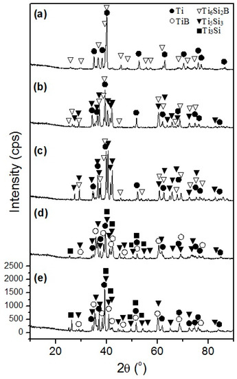 XRD patterns of the mechanically alloyed and hot-pressed: (a) Ti-2Zr-10Si-5B; (b) Ti-5Zr-20Si-10B; (c) Ti-10Zr-20Si-10B; (d) Ti-15Zr-20Si-10B; and (e) Ti-20Zr-20Si-10B alloys.
