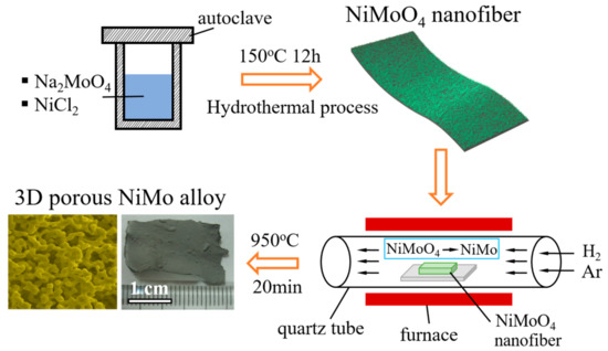 The fabrication process of 3D porous NiMo alloy, illustrated in Figure 1, was divided into two main procedures. Firstly, the NiMoO4 nanofibers, the precursor of porous NiMo, were synthesized through a standard hydrothermal method at 150 °C for 12 h. Secondly, the resulting NiMoO4 nanofibers dropped on Cu sheets and inserted into a quartz tube furnace were annealed at 400–950 °C for 20 min under the mixed gases of hydrogen and argon to reduce the oxidized precursor. After the furnace cooling down to room temperature, the annealed NiMoO4 samples were peeled off from the Cu sheets for characterizations and measurements. Moreover, the sheet area easily reached to 2 cm2 (Figure 1) when the area of Cu sheet was tuned.