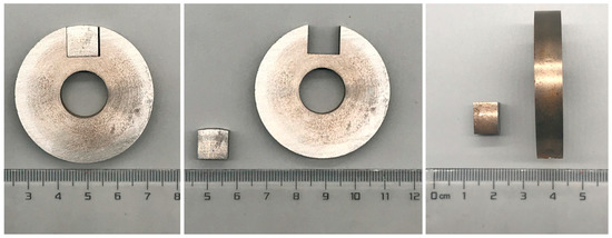 The blanks were pressed on a mechanical press under a pressure of 650~700 MPa. The sintering process was performed via a single normal-temperature sintering (1393 K × 30 min) route in a continuous furnace under an ammonia dissolving atmosphere. Ammonia dissolving is used as a protective atmosphere to protect the parts from oxidation during the sintering process. It does not have any chemical reaction with the parts. The carbon potential was controlled by the protective ammonia dissolving atmosphere so that the carbon content of the blank was maintained at the same level as the original ones. All of the part densities were well controlled by compacting. After sintering, the densities of green parts with each of the different carbon contents were measured based on the Archimedes drainage method, with the values fluctuating between 7.08 and 7.12 g/cm3. The average density of the sintered samples was then calculated at about 7.10 g/cm3. Sample photographs are shown in Figure 1, and the dimensions are outer diameter (OD) = 25 mm, inner diameter (ID) = 15 mm, thickness = 8 mm.
