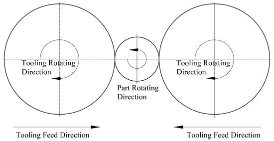 The rolling densification process was carried out on a FLEX M20 HCN rolling machine from Escofier, Chalon-sur-Saône, France, as shown in Figure 2. During the rolling process, two roller dies were spinning in the same direction and at the same speed. Through moving both of the roller dies with pressure on the components, the surface area was densified. During the process, the rolling speed was 30 r/min and the feeding speed of the roller dies was 0.6 mm/s. After reaching the preset distance, the roller dies stopped the feed at 0.8 mm and kept the distance for 1 s. These parameters of the rolling process have been studied in our previous research [16], and it was found that with these parameters we can produce PM parts with a surface dense-layer deeper than 0.3 mm and a density higher than 7.5 g/cm3. This meets the performance use requirements.