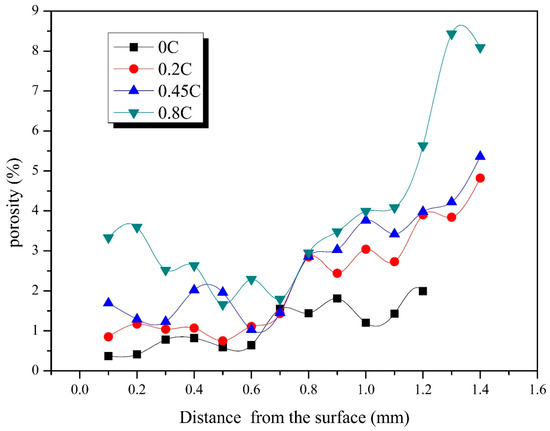 The porosity distribution on the cross-section in the surface layer is shown in Figure 3. It can be seen that as the carbon content increases, the overall level of porosity in the densified layer increases. It is obvious that the porosity of 0 C is the lowest of all the specimens. The porosity of 0 C fluctuates less than 2% in a large region (0–1.2 mm from the surface). Therefore, the dense layer depth (defined as porosity <3.84% [13]) of the 0 C samples is the thickest in this work. The porosity of 0.2 C is obviously higher overall than that of 0 C in the surface layer, and it has some fluctuations after 0.7 mm with a mostly upward trend. The porosity distributions of 0.45 C and 0.8 C show large fluctuations and instability in the dense layer region. The porosity declines first and then rises from the surface to the center in the 0.45 C and 0.8 C samples.