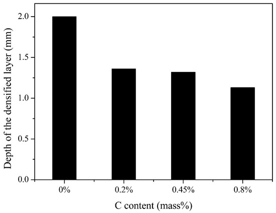 In this work, the variation of carbon content has little effect on the theoretical full density of the PM material. Therefore, the theoretical full densities are around 7.8 g/cm3 in 0 C, 0.2 C, 0.45 C, and 0.8 C specimens. The densification effect is obtained when the surface density is larger than 7.5 g/cm3, i.e., the porosity is less than 3.84%. Figure 4 shows the depth of the densified layer of all samples, and indicates that the densified layer depth of 0 C is 2 mm, which is the thickest. As the carbon content increases, the depths of 0.2 C, 0.45 C, and 0.8 C are 1.36 mm, 1.32 mm, and 1.13 mm, respectively.