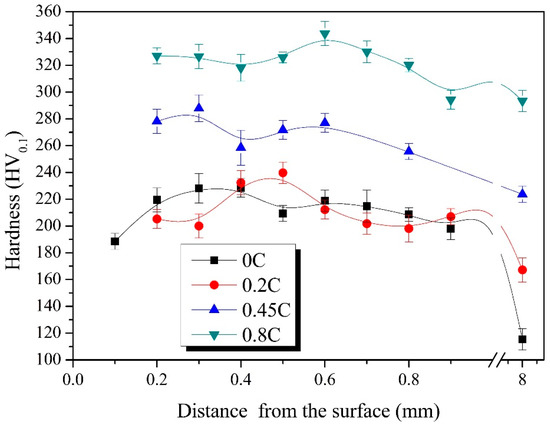 Figure 5 shows the microhardness distributions on the cross-section in the surface layer with different carbon contents. The hardness values at a distance of 8 mm from the surface can represent the hardness level of the matrix of the specimens. In Figure 5, it is shown that the hardness of the matrix increases with the increase of the carbon content. At the same time, the hardness of the densified areas of 0 C and 0.2 C are nearly the same, indicating that the same rolling condition can increase the hardness of the densified layer in 0 C and obtain the same level of densification with 0.2 C. When the carbon content of the samples increases to 0.45 wt. % and 0.8 wt. %, it shows higher hardness in the densified layer because the hardness of the matrix has reached a higher level. The highest hardness is 340 HV0.1 in the densified layer of 0.8 C.
