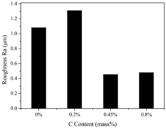 Sven Bengtsson et al. showed that the surface roughness of surface-densified parts is better than that of shaved parts [17]. Figure 6 shows the comparison of tooth flank roughness in 0 C, 0.2 C, 0.45 C, and 0.8 C specimens. It can be seen that the roughness levels of 0.45 C and 0.8 C reach 0.5 μm, which is only half that of the 0 C and 0.2 C samples.