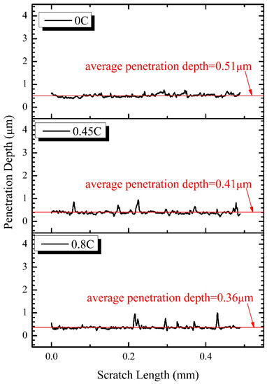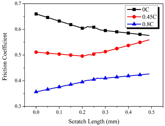 Figure 10 shows variation of the friction coefficient with scratch length in different specimens. The friction coefficient in 0 C shows the declining trend from the surface to the center. On the contrary, the friction coefficient of 0.45 C falls first and then rises starting from 0.25 mm, while the friction coefficient of 0.8 C shows an entirely rising trend in the densified layer. It can be seen from Figure 10 that the overall level of the friction coefficient of the sample density zone decreases with the increase of carbon content. The average value of the friction coefficient of 0.8 C reaches 0.4, which is the lowest of all the specimens, and that of 0.45 C and 0 C is more than 0.5 and 0.6, respectively.