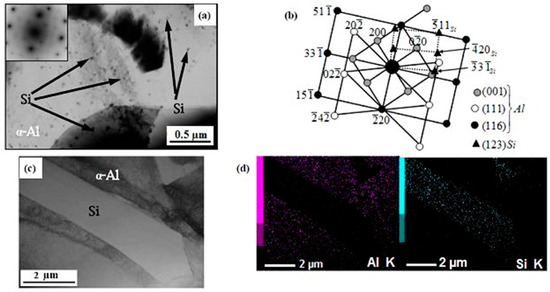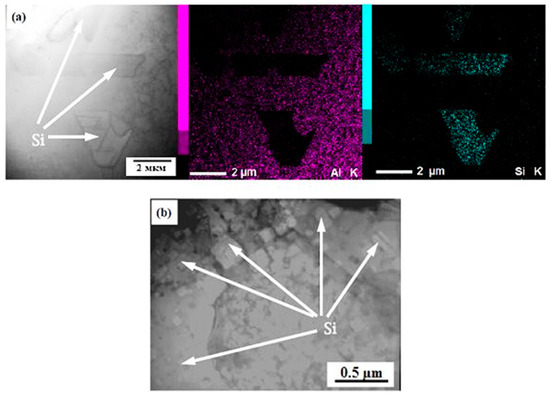 According to TEM, secondary silicon particles of a different shape formed in the α-Al grain. Crystals with a cubic shape and the size of ~0.05–2 µm and fine-dispersed particles similar to a spherical shape with the size of 0.008–0.07 µm were present in Figure 4a. It is possible to presume that the introduction of modifiers resulted in the local change in the concentration composition of the alloy. Figure 4d presents a dark-field TEM image of the modified Al-7%Si alloy, in which one can see that within coarse Si crystals of ~0.5 µm, there were Al nanoparticles of less than 30 nm. These data were justified by energy dispersive analysis and microdiffraction patterns taken of this area. One might suppose that during the cooling of the alloy in a solid state, the concentration of the aluminum sufficient for the precipitation of secondary α-Al grains increased locally in the grains of silicon (Si), representing a solid solution of aluminum in silicon. In the region of the eutectic, eutectic silicon precipitates had various geometrical shapes different from an needle- or plate-like one.