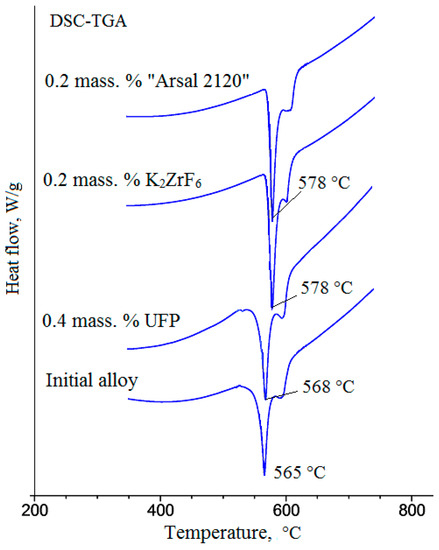 Figure 6 presents the DSC curves of the cooling of the Al-7%Si alloy both in the initial state and in the state when different modifying mixtures were introduced. It shows that after the introduction of 0.4 mass. % UFP, the solidification of eutectic Si proceeds at a higher temperature than that for the initial alloy, despite the fact that the liquidus temperature has changed by only 3 °С. According to the differential thermal analysis (DTA) data, a shift in the temperature of the crystallization of the eutectic containing silicon and aluminum crystals was observed. The structural changes during the solidification of eutectic Si were observed: the size of Si wafers decreased 1.5 times, but the morphology remained the same. Similar results were observed in Reference [2], and it was demonstrated that with the increase of the Sm content in the ADC12 alloy, the temperature of the primary solidification changed by 2 °C each time the agent was added, and the wafers of eutectic Si were refined without alteration of its morphology.