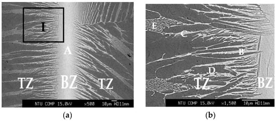 Figure 3 shows the EPMA BEIs of the joint brazed at 1000 °C for 600 s, and WDS chemical analysis results are displayed in Table 1. The brazed joint contains several distinct phases and structure. According to the EPMA chemical analysis, the white phase in the BZ is β-Ti, as marked by A in Figure 3a. The acicular white phase in TZ is identified as retained β-Ti as marked by B in Figure 3b. Both A and B have similar chemical composition but different morphologies. The black acicular phase in TZ is α-Ti alloyed with minor Nb and Ni, as marked by D in the figure. It is noted that a eutectoid of Ti2Ni and α-Ti is observed in the TZ next to CP-Ti substrate, as marked by E in Figure 3b. Microstructures of TZ is changed from retained β-Ti plus acicular α-Ti close to the BZ into eutectoid plus acicular α-Ti next to CP-Ti substrate.