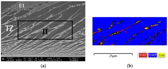 Figure 4 shows SEM/EBSD crystallographic analysis of the TZ between the BZ and CP-Ti substrate brazed at 1000 °C for 600 s. According to Figure 4b, there are mixtures of retained β-Ti and Ti2Ni along lath boundaries of acicular α-Ti. It is worth mentioning that retained β-Ti and Ti2Ni have similar color in BEIs (Figure 3b and Figure 4a). They can be easily distinguished by SEM/EBSD crystallographic analysis. According to Figure 4, the TZ comprises of Ti2Ni/α-Ti eutectoid, retained β-Ti, and Ti2Ni along lath boundaries of acicular α-Ti matrix. Because Nb-Ni-Ti ternary alloy phase diagram in the Ti-rich corner is still not available, related binary alloy phase diagrams are cited in order to unveil microstructures of brazed joints [,].