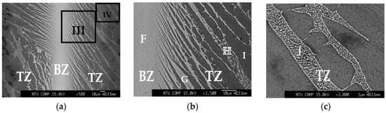 Although both Nb and Ni can stabilize β-Ti, they take part in different roles []. Nb-Ti belongs to β isomorphous, and Ni-Ti is classified as β eutectoid. The transport mechanism of Nb and Ni from the BZ into CP-Ti substrate primarily relies on solid-state diffusion of Nb and Ni in β-Ti during brazing. The diffusion activation energies of Nb and Ni in β-Ti are 39.3 and 29.6 kcal/mol, respectively []. Therefore, Ni has a much higher diffusivity in β-Ti than Nb. According to the binary phase diagrams of Nb-Ti and Ni-Ti, the β-Ti can be alloyed with Ni up to 10 at %, but it cannot be stabilized to room temperature without alloying with Nb []. The Ni is alloyed in the retained β-Ti with 8.3 at % Nb, as illustrated at location G of Figure 5b. It is also noted that the eutectoid of Ti2Ni and α-Ti is found in the TZ close to the CP-Ti substrate marked by H and J in Figure 5b,c. The chemical compositions in at % of location J are 90.6 Ti, 9.3 Ni, and 0.1 Nb. Slow diffusion of Nb in the β-Ti results in forming low Nb and high Ni contents of β-Ti, and it decomposes into fine eutectoid of Ti2Ni and α-Ti, as shown in Figure 5c.