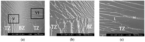 EPMA BEIs of CP-Ti/40Ti-35Ni-25Nb/CP-Ti joint brazed at 1200 °C for 600 s: (a) cross section overview, (b) higher magnification of location V in (a), (c) higher magnification of location VI in (a).