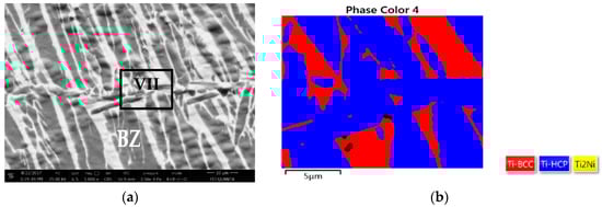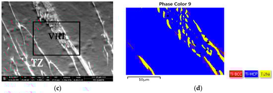 Figure 7 shows SEM/EBSD analysis results of the joint brazed at 1200 °C for 600 s. According to Figure 7a,b, the BZ consists of acicular α and β-Ti. It is consistent with the EPMA analysis results (Figure 6 and Table 3). In the TZ, the eutectoid of Ti2Ni precipitates and α-Ti is demonstrated in EBSD phase distribution map of location VIII in Figure 7c. It agrees with the EPMA chemical results of Figure 6c and Table 3. However, there are a few red retained β-Ti streaks in the eutectoid, as illustrated in Figure 7d. Streak-like Ti2Ni and retained β-Ti are identified along the lath boundaries of acicular α-Ti matrix due to insufficient Nb alloyed in the β-Ti during brazing. Consequently, the stability of β-Ti is strongly related to its Nb content.