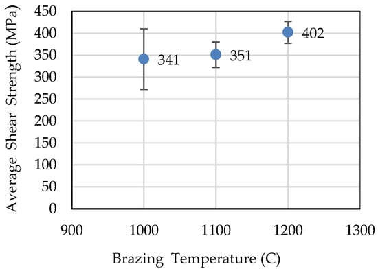 Although the average shear strengths of joints brazed at different temperatures are approximately the same level, standard deviations of average shear strengths are quite different, as illustrated in Figure 8. The standard deviation of the joint brazed at 1000 °C demonstrates the highest value of 69 MPa. Increasing the brazing temperature to 1100 or 1200 °C results in decreasing the standard deviation to 29 or 25 MPa, respectively. The presence of inherent brittle Ti2Ni intermetallics results in higher standard deviation in the shear test result. It is preferred that a higher brazing temperature, such as 1200 °C, contributes to decrease the amount of Ti2Ni in the joint. The reliability of the brazed joint is improved in practical engineering application.