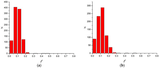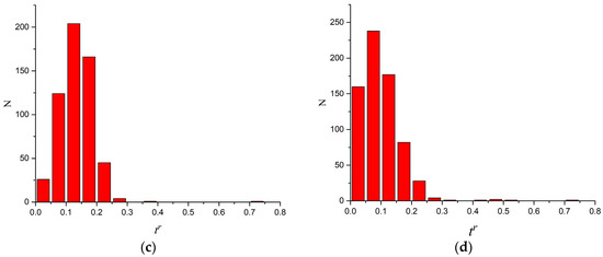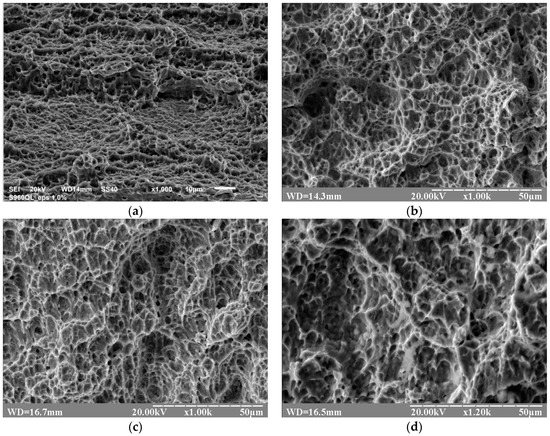 The investigated fracture surface has an eddy structure that formed as a result of the micropore coalescence and the destruction of interstices between them. The formation of pores was accompanied by localized deformation processes within their boundaries [14,15]. However, they are sufficiently clear, which allowed for identifying individual dimples and evaluating their parameters. Figure 4a–d shows distribution histograms for equivalent diameters of dimples shown in images from Figure 1.
