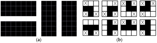 Filter kernels to highlight the areas of the image corresponding to the vertice of function (a); templates for skeletonization (b), mark “×” corresponds to pixels of any color.