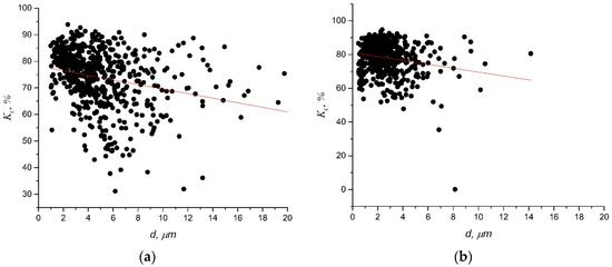 Point diagrams showing the dependence of the dimple shape parameter Kc on its equivalent diameter were constructed (Figure 6). To summarize their results, they were approximated by a straight line using the least squares method. It is found that straight lines were located at angles 80°, 81°, 79°, 77° to the vertical line, respectively, i.e., in a sufficiently narrow range. At the same time, an increase in the angle of inclination indicates an increase in the integral approximation of the analyzed dimples to the circular shape. It is found that small dimples of tearing are close to the circular shape (Figure 6). Further propagation and coalescence of dimples indicates a certain tendency to acquire a more circular shape. In addition, boundary effects become smooth and get orientation along a certain direction.