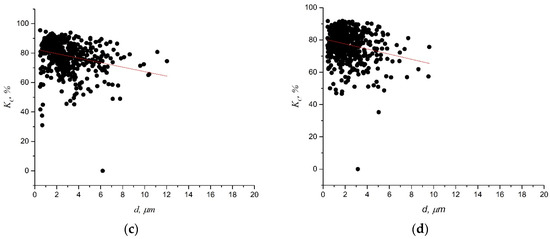 Dependence of the dimple shape parameter Kc on its equivalent diameter d for alloys VT23 (a) and VT23M (b–d) under static (a,b) and impact (c,d) loading.