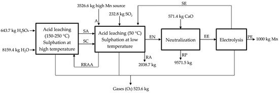 In our project we propose treating anodic lodes and scrapings from the zinc electrolysis. It would be also possible to recover other raw materials/residues of manganese, classified in: chemically refractories (difficultly lixiviated, such as slags, powders, or other residues coming from the pyrometallurgy of manganese) and reactive (easily lixiviated, such as anodic lodes and scrapings of the zinc electrolysis and manganese carbonates). We designed a process that we have divided into four sub-processes (see Figure 1): acid leaching at low temperature (50 °C), acid leaching at high temperature (150–200 °C), neutralization with CaO (s), and chemical purification and electrolysis process. In this way, a conceptual design of plant was carried out while considering a production of 1000 kg of Mn (metal) every day. Even when the objective is obtaining electrolytic manganese, widely used in the production of aluminum and copper alloys, for special grades of stainless steel and other special steels, and for electronic applications [13], the process described could be applied for the obtaining of manganese sulphate, which could be sold as MnSO4 or used in the production of manganese oxide (IV) and manganese oxide (II).