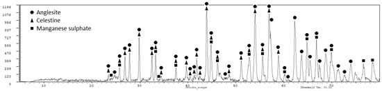The residue obtained after filtering was analyzed by X-ray diffraction (PANalytical X’Pert Powder, Servicios Científico-Técnicos, Universidad de Oviedo, Oviedo (Asturias), Spain) and the following phases were obtained (see Figure 2, which is consistent with the information provided in Table 2): anglesite (PbSO4) as the main phase, and sulphates of manganese and strontium. Lead is recovered in the solid residue obtained after the filtration as lead sulphate. This lead sulphate could be used in the manufacture of lead [9]. The presence of certain amount of manganese in the solid residue is always unavoidable, as we did not reach a full extraction of manganese. Other impurities also end in the solid residue as calcium, strontium, and potassium, but also silver. The presence of silver and lead in the solid residue of filtration makes it economically interesting. The solution containing most of the manganese (as MnSO4) should be purified before being used to produce electrolytic manganese.