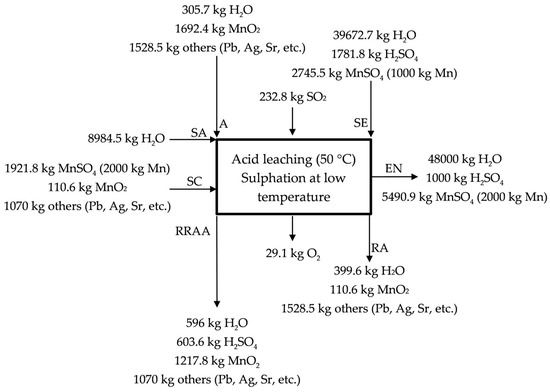 The objective of this stage of the process is reducing MnO2 in presence of a reductant agent, SO2 (g) (other reducing reagents have been used in treating manganese ores, such as oxalic acid, hydrogen peroxide and glucose [15], cornstalk [16], phenols [17], cane molasses [19], CaS [20], carbon [23] or waste tea [34]) and obtaining a solution of MnSO4 (aq) to be sent to the neutralization stage, and then to electrolysis. The mixed leaching allows for recovering almost all of the manganese of the anodic lodes and scrapings (95% is supposed in the calculations). The reactivity of the waste is exploited in this stage as a kind of neutralization of the sulfuric acid coming from other stages, supported by the utilization of SO2 as reductant reagent. The low manganese waste contains valuable elements, such as lead and silver (see Table 2), coming from both the low and high temperature leaching processes.