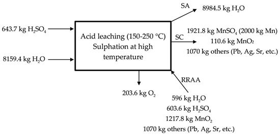 The acid leaching at high temperature is described in Figure 4 for the industrial scale proposed process. The process would be like that described in Equation (7), but when considering the industrial scale. It is necessary to supply water and sulfuric acid in this stage to obtain the solution of manganese sulphate. 70% of the initial manganese is lixiviated in this stage by following the reaction presented in the Equation (7). A MnSO4 (aq) solution is sent with the MnSO4 (aq) solution obtained in the low temperature lixiviation to the neutralization process. The residue containing lead, silver, strontium, etc., leaves the process as RA in Figure 1.