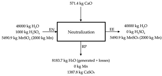Free acidity (pH < 1) is assumed at the entrance of the neutralization process (EN), while at the end of the neutralization pH = 6 is considered (~0 kg free H2SO4) (EE). The neutralization process is described in Figure 5. As neutralizing agent, CaO (s) is used, leaving a residue containing CaSO4 (s) hydrated and most of the impurities (Zn, Co, Cu and Ni) (RP) that could make impure the solution used in the obtaining of manganese by electrolysis. Lime (CaO) is proposed in Figure 5 as neutralizing agent, however, manganese carbonates and even lodes could be used as neutralizing agents. The MnSO4 (aq) solution that is enriched in Mn (50 g Mn/kg H2O) is sent to electrolysis. Part of the water would be recirculated in the process.