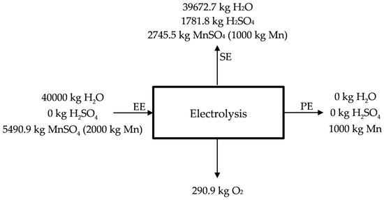 Under the premise of a double leaching, a proposal for industrial upscaling was presented for the treatment of anodic lodes and scraping from the zinc electrolysis (this process could be applied in the treatment of other wastes/raw materials, as described in the Section 2.2). Even when the calculations of the main raw materials consumed in the process (water, sulfuric acid, residue and lime) were carried out under the objective of obtaining 1000 kg of electrolytic manganese with recirculation of the sulfuric acid that is generated in the electrolysis, it could be applied in the obtaining of manganese oxide (II), manganese oxide (IV), or manganese sulphate, depending on the market and economic conditions (for instance, high price of the electricity or strong demand of the each one of the manganese products). In that case, the process could be stopped after the mixed leaching (sulfuric acid supply would be increased). The obtaining of manganese oxides (II) and (IV) would be carried out through the following chemical reactions. First of all, manganese is precipitated by using ammonia ():