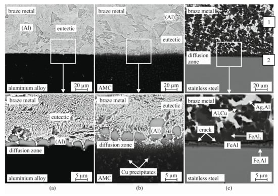 - Weis, S.; Elßner, M.; Wielage, B.; Wagner, G. Wetting behavior of AlAgCu brazing filler on aluminum matrix composites and stainless steel. Weld. World 2017, 61, 383–389. [Google Scholar] [CrossRef]