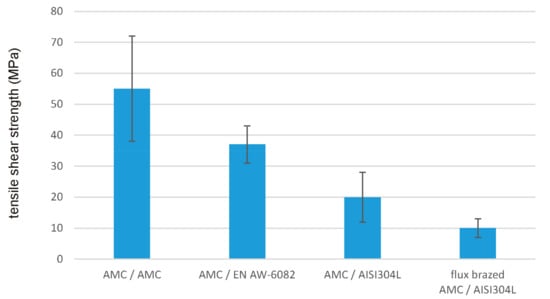 - Elßner, M.; Weis, S.; Grund, T.; Hausner, S.; Wielage, B.; Wagner, G. Lichtbogenlöten von Aluminiummatrix-Verbundwerkstoffen mit AlAgCu-Loten. Werkstoffe und werkstofftechnische Anwendungen 2014, 52, 181–186. [Google Scholar]