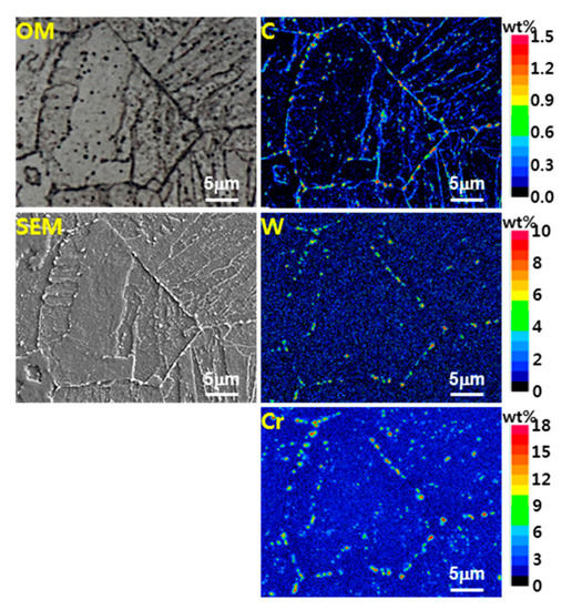 Figure 3 shows the result of composition analysis using EPMA for the phase analysis of the base metal. The precipitates where the alloying elements of C, W, and Cr are concentrated in a point shape according to the prior austenite grain boundary can be observed.
