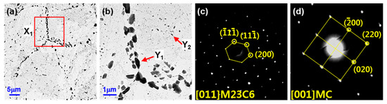 The results of TEM analysis of the precipitates using carbon replica method are shown in Figure 4 to analyze the precipitate in the transgranular and grain boundary. In the TEM photographs, Figure 4a,b, a coarse precipitate of rectangular or rhombic shape is observed at the prior austenite grain boundary, and fine precipitates are observed in the transgranular. From the pattern analysis, it can be concluded that the coarse precipitate of Y1 is the M23C6 carbide of [011] FCC, and the circular fine precipitate within the grain of Y2 is the MC carbide of [001] FCC. From the EPMA results in Figure 3, the M of M23C6 carbide is the Fe, Cr, and W alloy elements. As MC is approximately 50 nm or less, it is considered that V, W, and Nb were not detected in the EPMA analysis.