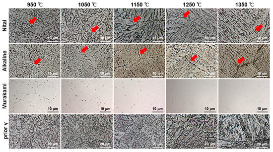 Figure 5. Optical microstructure with various etchants (nital, alkaline sodium picrate, Murakami, and prior γ) and various peak temperatures.